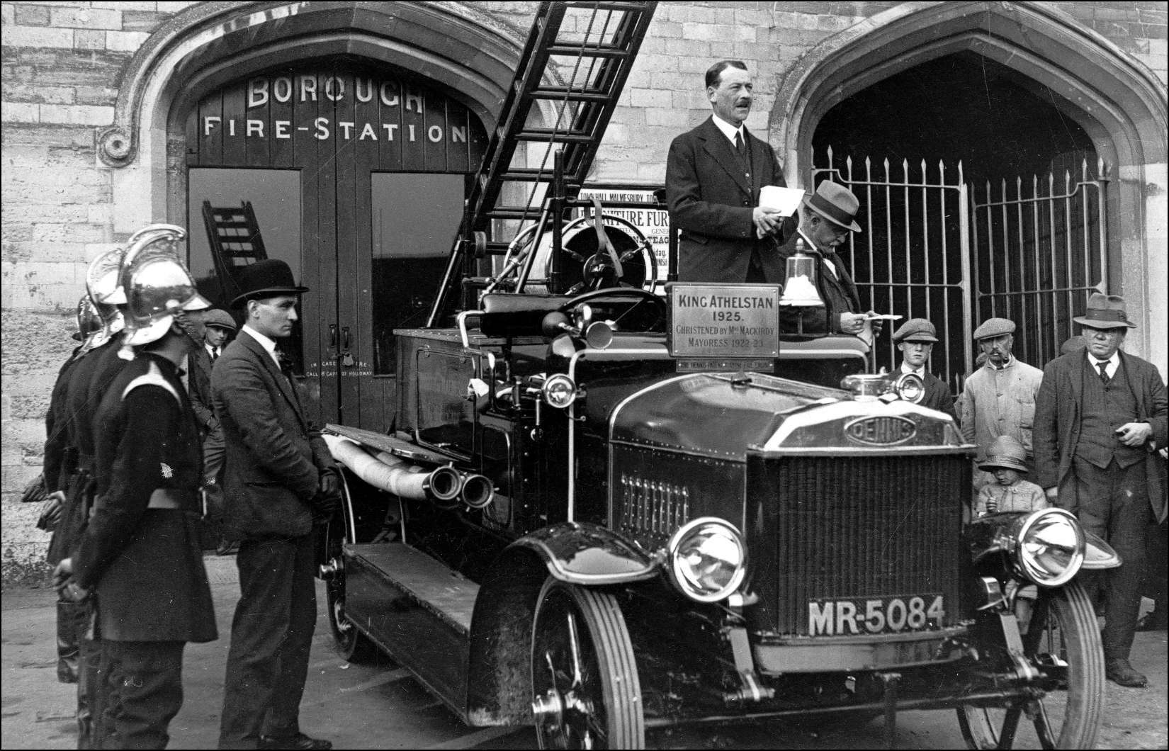 After much discussion and controversy the old steam pump was retired and put up for sale and money was put together to buy a motor driven fire engine. In September an order was placed resulting in the commissioning of a 250-300 gallon light turbine Dennis 35 hp fire engine with ladder. Later christened “King Athelstan”. It had spoke wheels and solid tyres. It was stated in a press report covering the commissioning ceremony that,